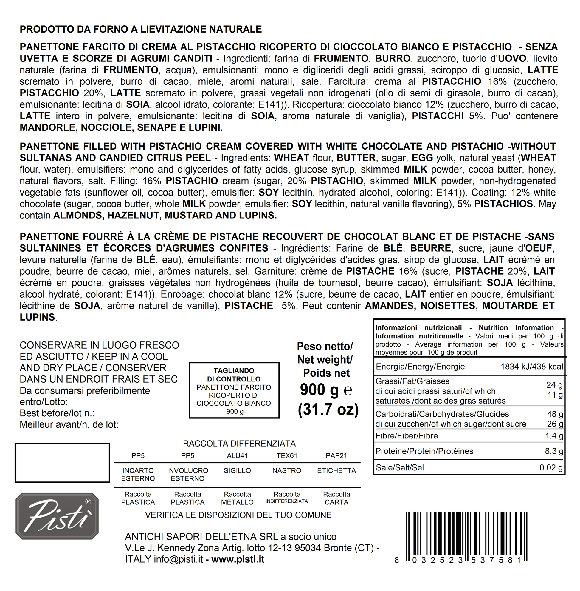Ricopertura: cioccolato bianco 12% (zucchero, burro di cacao, LATTE intero in polvere, emulsionante: lecitina di SOIA, aroma naturale di vaniglia), PISTACCHI 5%.
