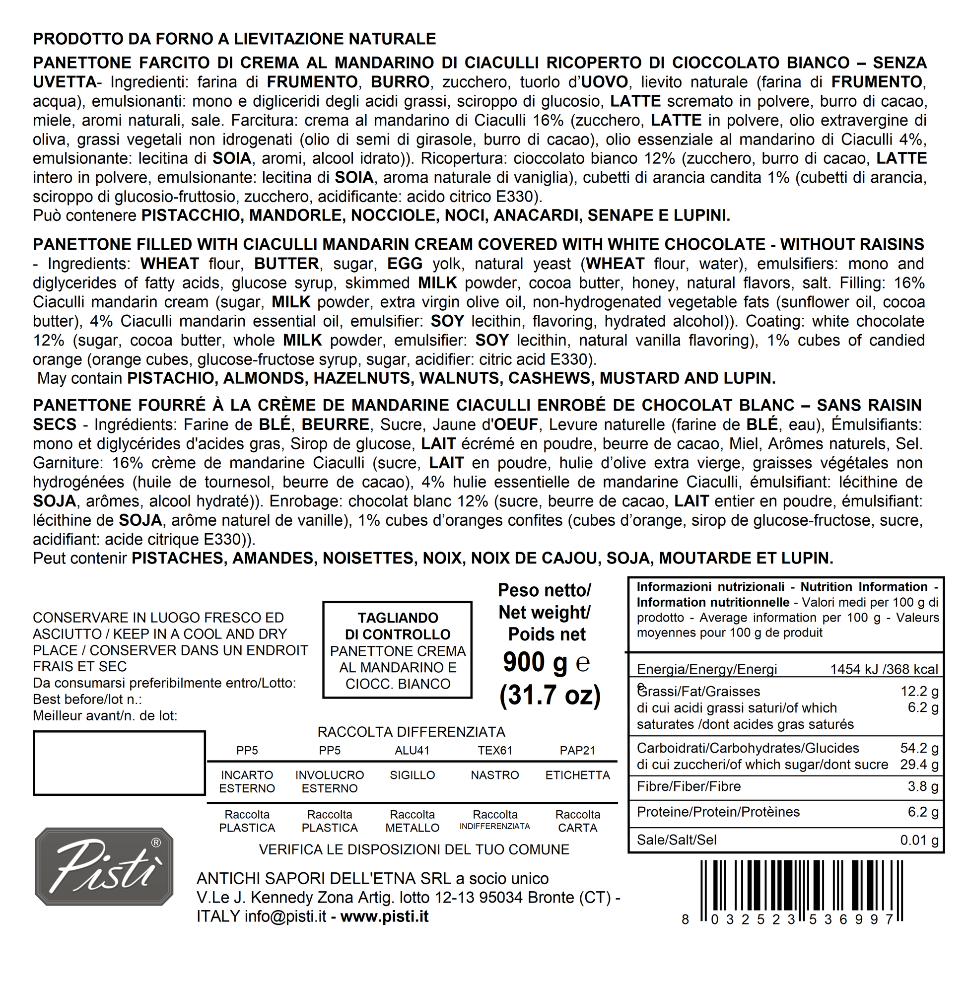 Panettone farcito di crema al mandarino di Ciaculli ricoperto di cioccolato bianco: Delicato nel gusto, soffice nella sua perfetta consistenza: il panettone ripieno di crema al mandarino di Ciaculli e ricoperto da una finissima glassa di cioccolato bianco. Incarto a mano da 900 g quantità max ordinabile 20pz.