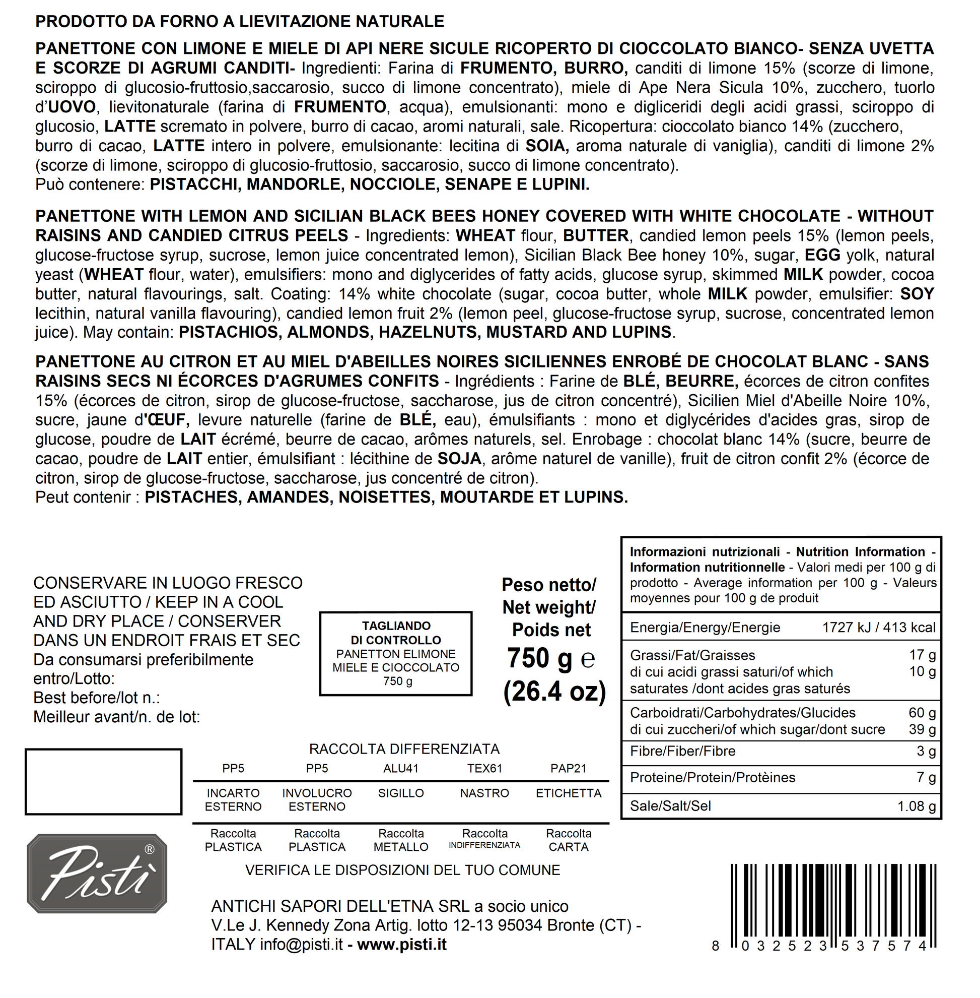 Farina di FRUMENTO, BURRO, canditi di limone 15% (scorze di limone, sciroppo di glucosio-fruttosio, saccarosio, succo di limone concentrato), miele di Ape Nera Sicula 10%, zucchero, tuorlo d’UOVO, lievito naturale (farina di FRUMENTO, acqua), emulsionanti: mono e digliceridi degli acidi grassi, sciroppo di glucosio, LATTE scremato in polvere, burro di cacao, aromi naturali, sale.