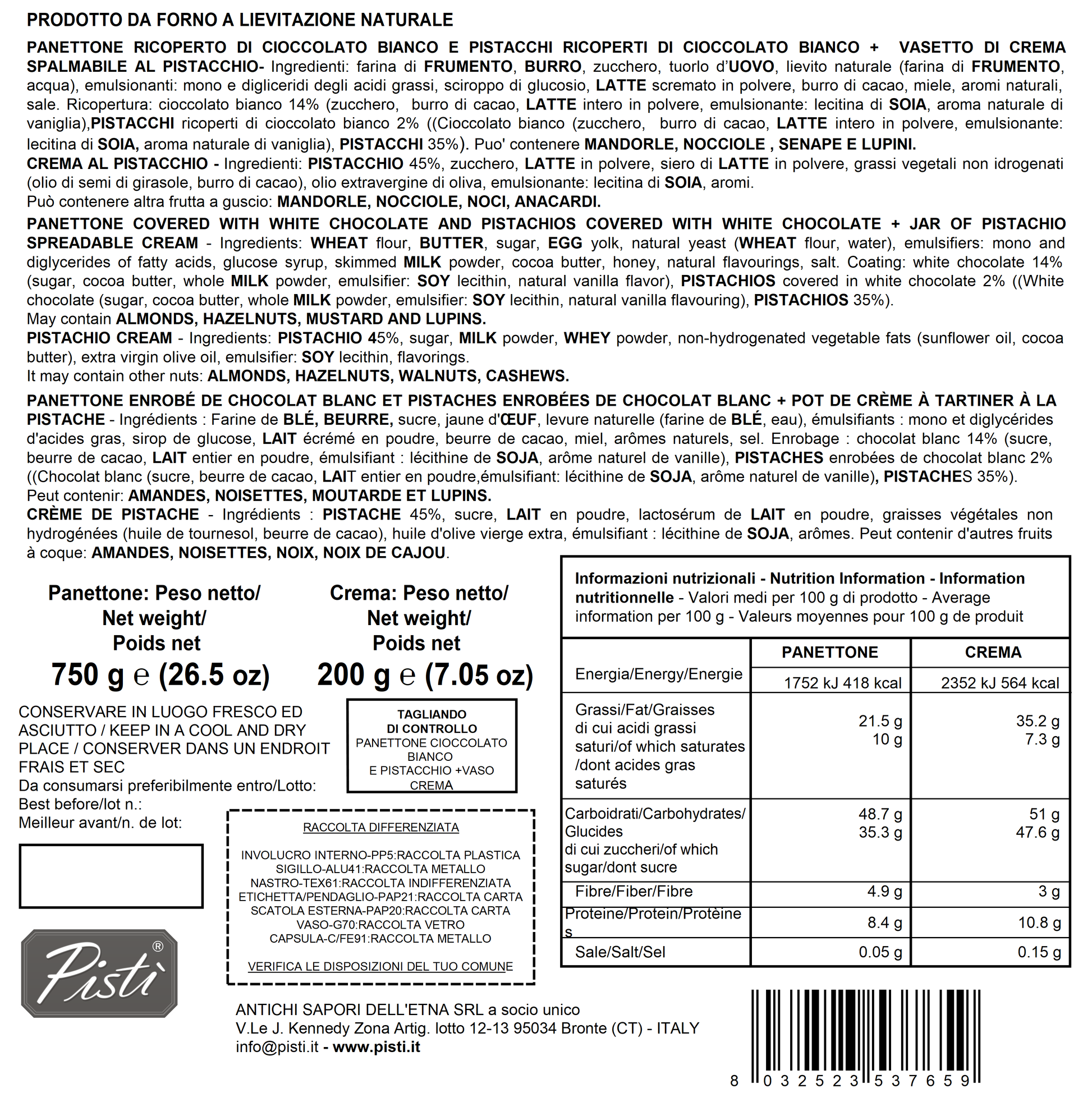 Ricopertura: cioccolato bianco 14% (zucchero, burro di cacao, LATTE intero in polvere, emulsionante: lecitina di SOIA, aroma naturale di vaniglia), PISTACCHI ricoperti di cioccolato bianco 2% ((Cioccolato bianco (zucchero, burro di cacao, LATTE intero in polvere, emulsionante: lecitina di SOIA, aroma naturale di vaniglia), PISTACCHI 35%).